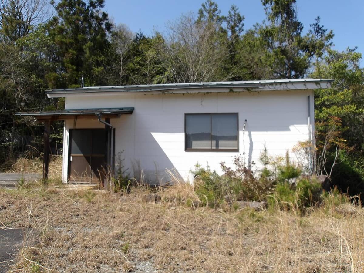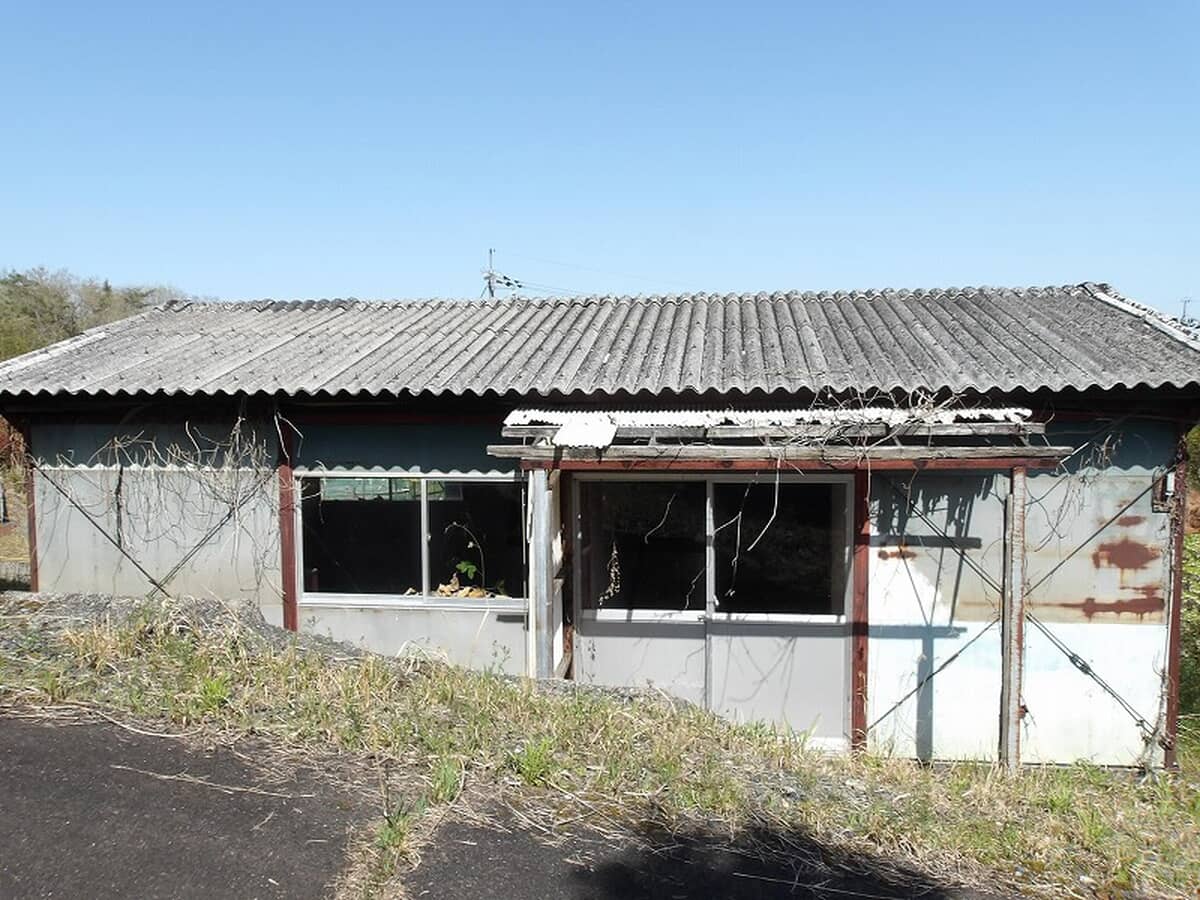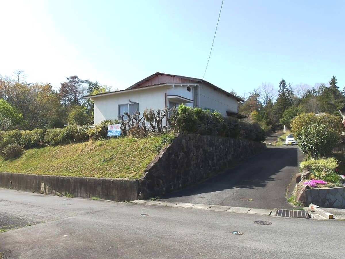 高台の平屋、広い駐車場と倉庫付きの物件。