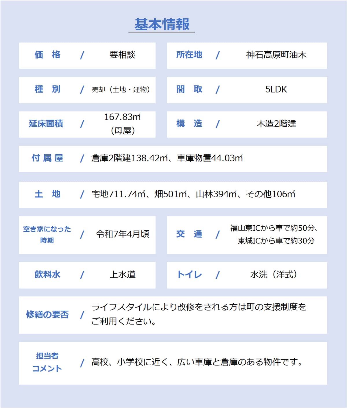 【神石高原町290】高校、小学校に近く、広い車庫と倉庫のある物件です。